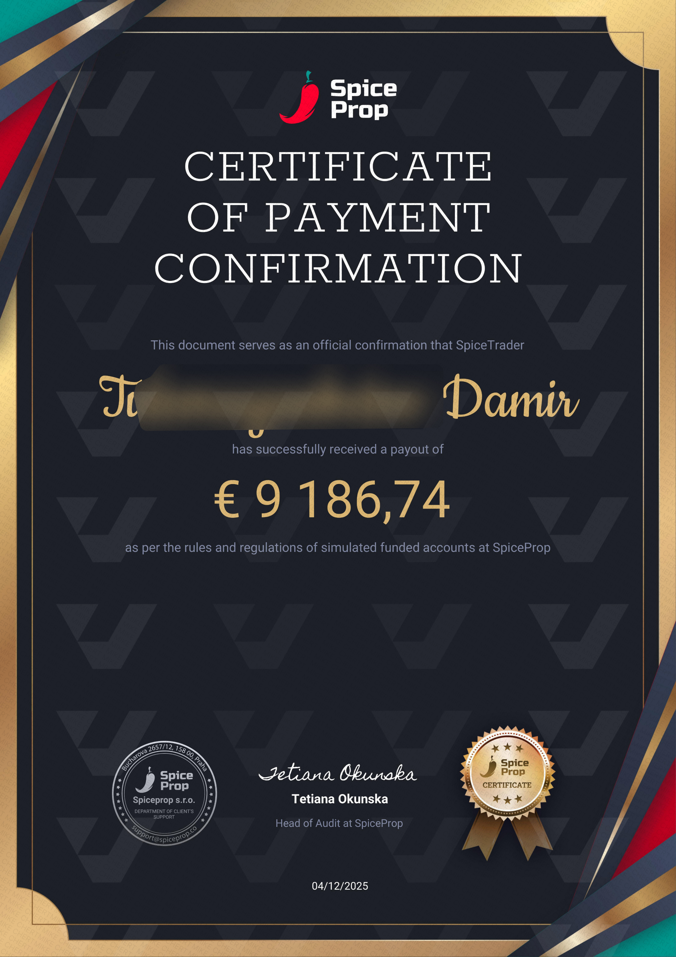 List of certificates about payouts we received. All payouts are independently verified and documented.